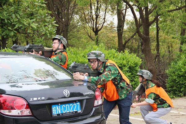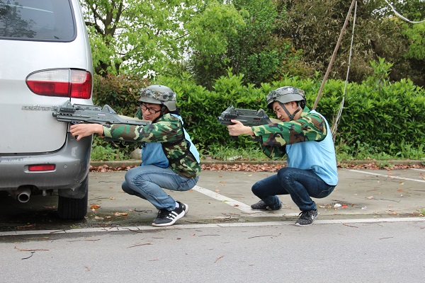 中午小憩之后,真人CS实战正式拉开帷幕,队员们仔细聆听教练讲解的装备知识和基本战法。在挑选完各自装备后双方队员早已跃跃欲试,迫不及待地准备战斗。